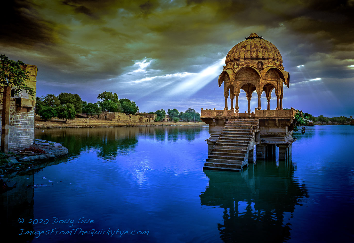 This is a sacred lake in Jaisalmer, India. It features cenotaphs, or empty tombs. We happened to catch this with Godlight.