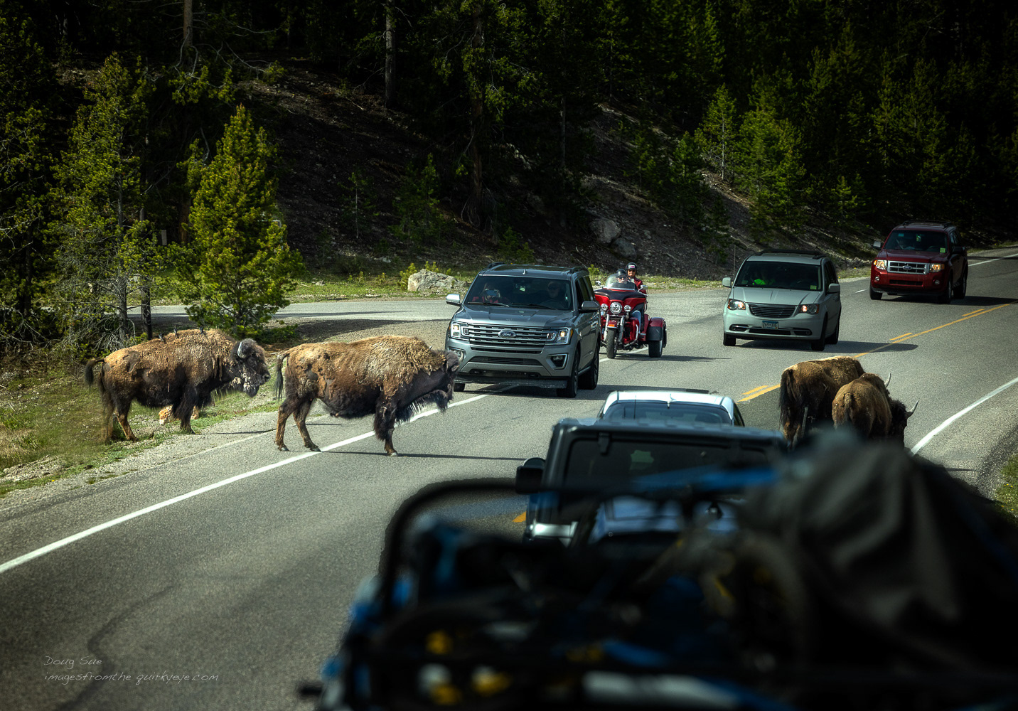 Bison crossing! Respect these guys -- they can turn your car over or cause a huge insurance bill.
