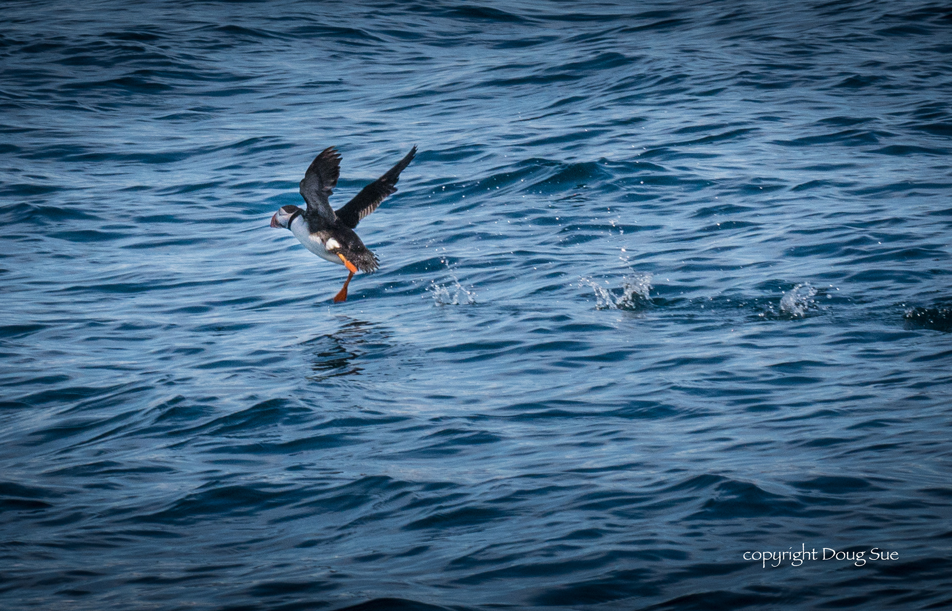 Puffins dive into the water to feed.
