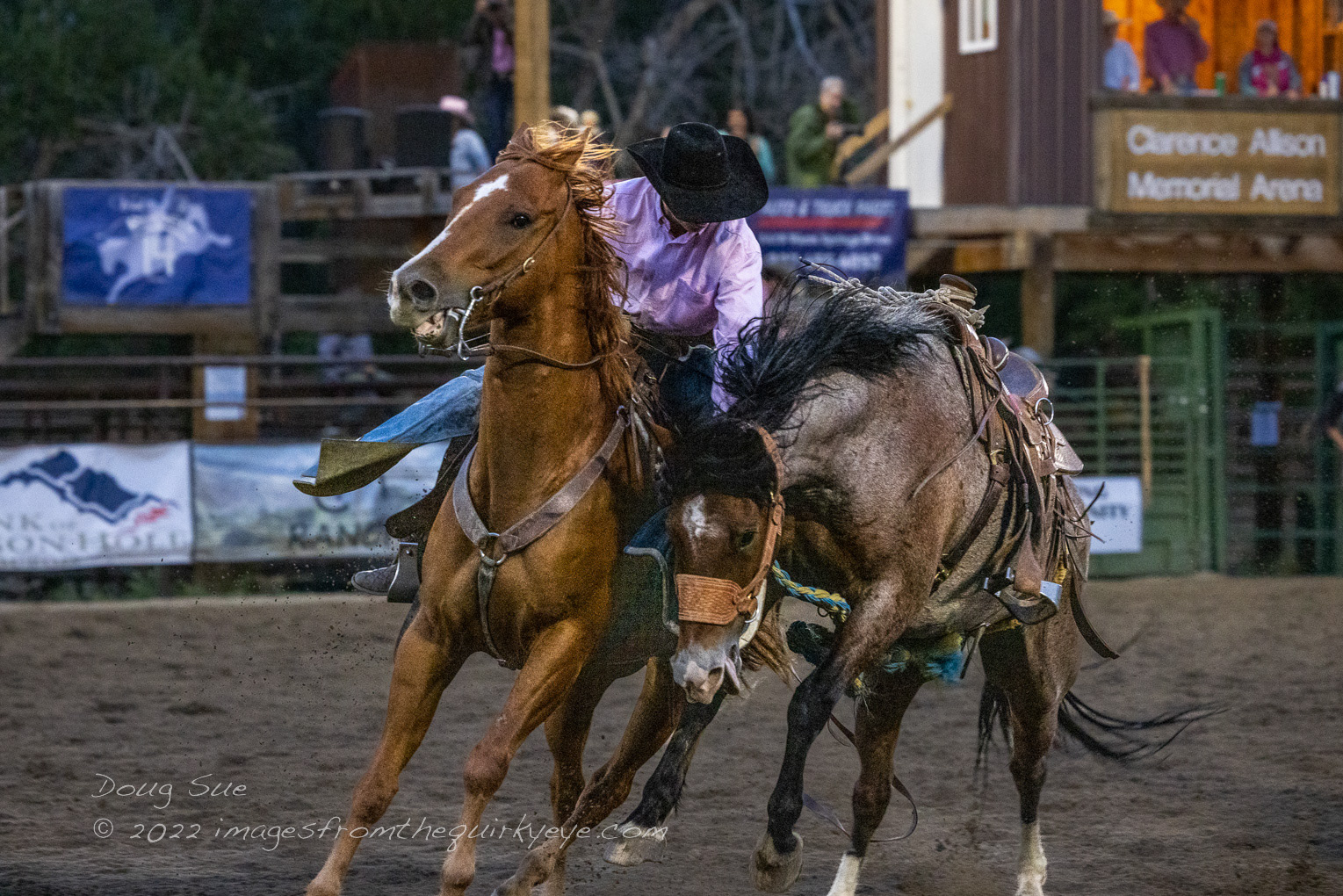 Retrieving a bronco at the Friday night rodeo.